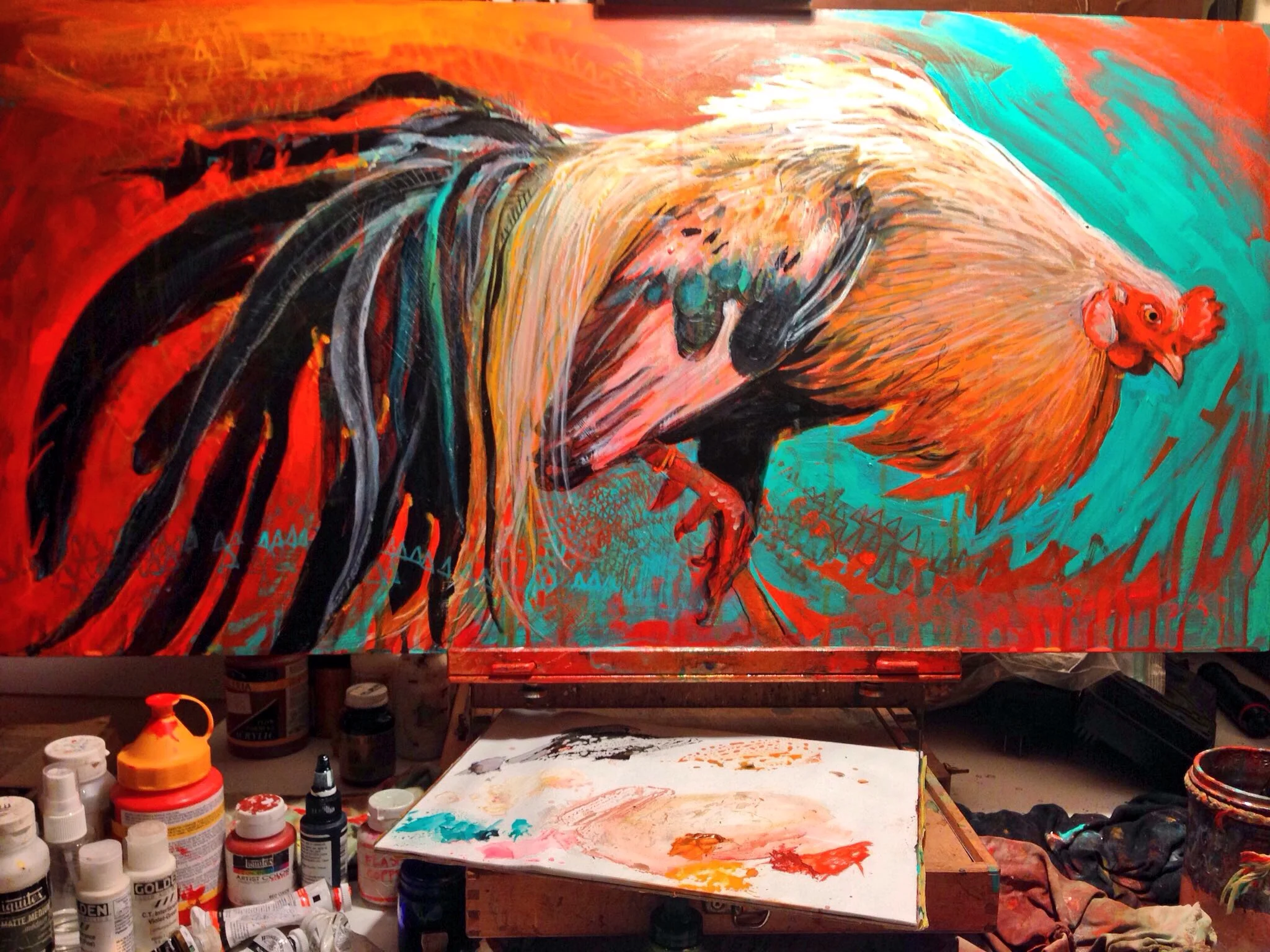My work combines three of my life passions: rare ornamental fowl, photography and painting. I keep a diverse flock of phoenix and yokohama mix chickens and I raise a new generation of them each season. I photograph them daily from across my yard with a 300 mm zoom lens, so I don't disturb their natural (and entertaining) behavior. Out of the thousands of photos I take, a few always stand out to me, which I then try to paint. I use their imagery as source material for exploring the deeply meditative act of art-making. I work with acrylics, colored pencils, shimmering inks, gold leaf, and various drawing materials, on mostly wood surfaces. I try to capture the beauty, bold character and unique personalities of my chickens, while exploring color, materials, anatomy, and the capabilities of my mind.